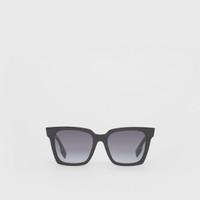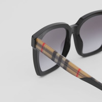 PRODUCT DETAILS An angular silhouette in black acetate, accented with Vintage check temples. Frame width: 14.8cm/5.8in Frame height: 5.3cm/2.1in Acetate frame Scratch-resistant gradient dark grey lenses with 100% UV protection Made in Italy Comes with a hard leather case and cleaning cloth 40816711