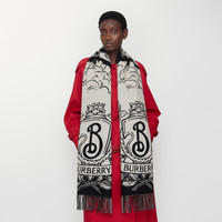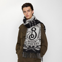 Product Details A scarf made in Italy from cashmere, jacquard-woven with our Equestrian Knight Design and B crest set against a stormy night’s sky. The design reverses to the Burberry Check and the fabric is washed for an ultra-soft finish and raised nap. - Rectangular - Fringing at both ends - Jacquard-woven Burberry lettering at ends - Item 81093721 Size & Fit - 210 x 50cm/82.7 x 19.7in Fabric & Care - 100% cashmere - Specialist dry clean - Made in Italy