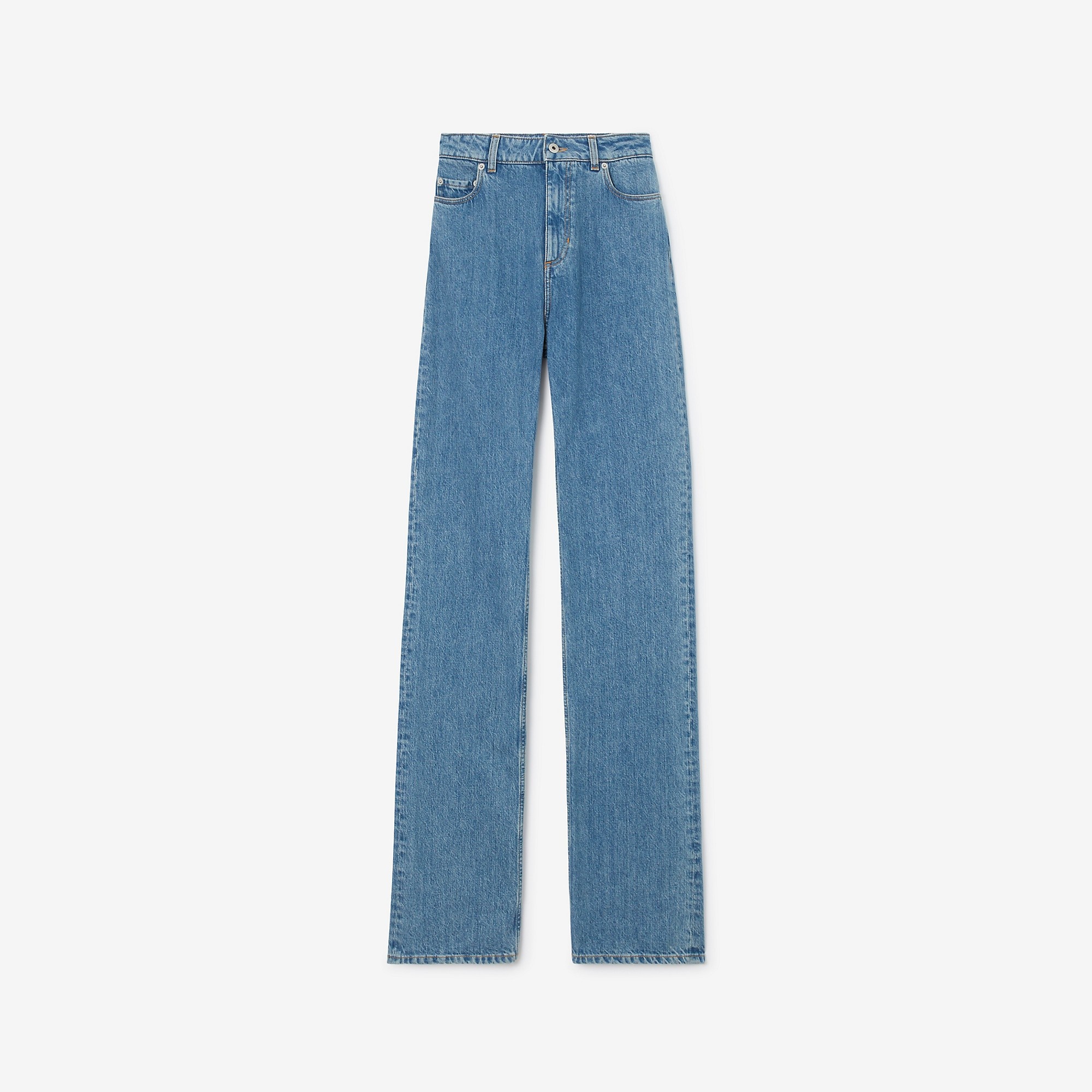 PRODUCT DETAILS High-rise jeans detailed with a leather patch embossed with our logo. - Inside leg length: 85cm/33.5in. This is based on a size UK 26. - Model’s height: 177cm/5ft 10in. Model wears size UK 25. 100% cotton Trim: 100% calf leather Heavyweight denim High rise, straight fit Button and zip fly closure Leather patch with embossed Burberry lettering at back Machine wash inside out Made in Italy Item 80712121