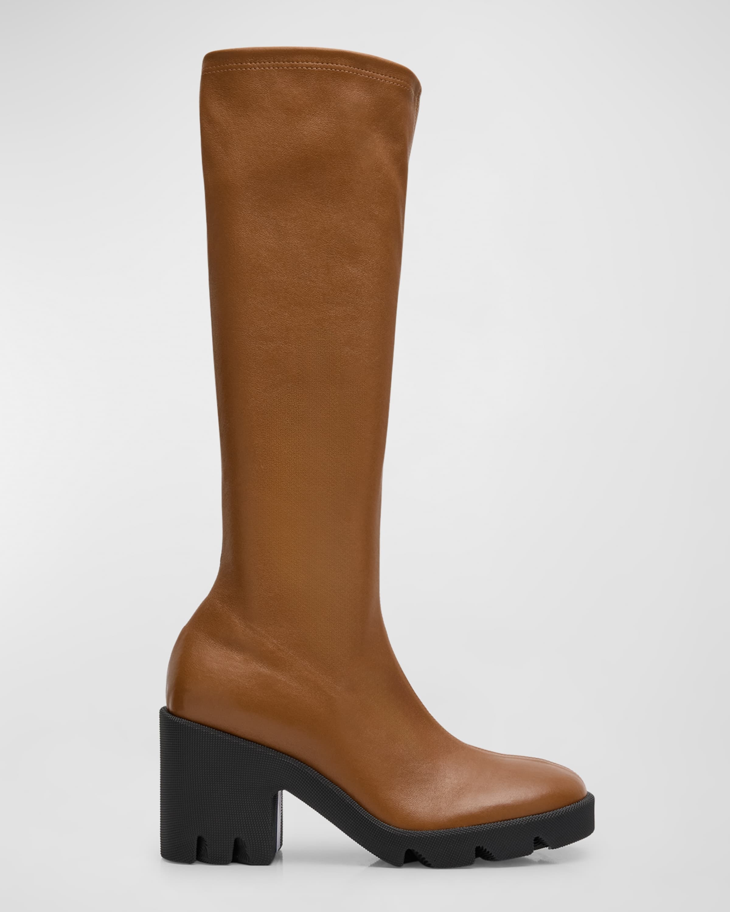 - Burberry "Stride" stretch leather tall boots - 2.50 in / 65 mm chunky block heel - Round toe - Side zip eases dress - Lugged rubber sole - Made in Italy Online Inquiries: NMS21_X6MM3 Store Inquiries: #4829667