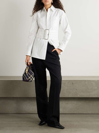 EDITORS'NOTES From Burberry's Spring '25 collection, this button-down puts a fresh twist on business shirting. It's cut from crisp, pinstriped cotton-poplin and has a wide buckled belt that defines the waist. Wear yours with tailored pants. SIZE & FIT Model measurements: - Fits true to size, take your normal size - Designed for a slightly loose fit, use the belt to cinch in at the waist - Mid-weight, non-stretchy fabric - Model is 180cm/ 5'11" and is wearing a UK 8 - Bust: 79cm/ 31" - Waist: 65cm/ 25.5" - Hip: 90cm/ 35.5" DETAILS & CARE - White and navy cotton-poplin - Partially concealed button fastenings through front - 100% cotton - Dry clean - Mother-of-pearl: Vietnam