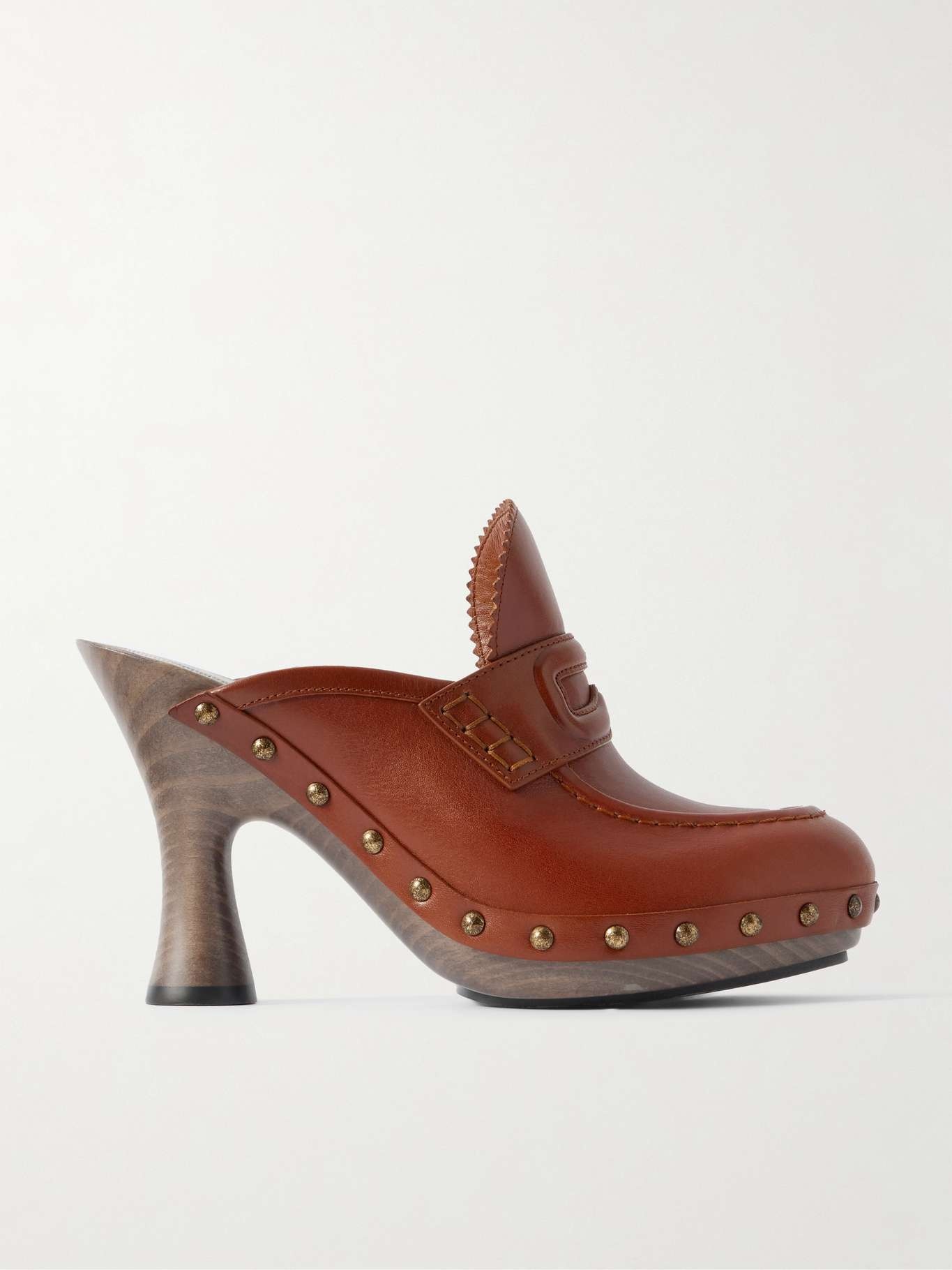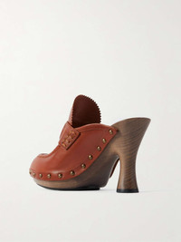 EDITORS'NOTES Burberry's mules draw inspiration from both clogs and loafers. Made in Italy from leather, they have laser-cut notched vamps and penny straps that feature B-shaped cutouts at the center. Burnished gold-tone studs punctuate the wooden soles, while the footbed reveals the signature checked motif. SIZE & FIT - Fits true to size, take your normal size - Italian sizing DETAILS & CARE - Heel measures approximately 75mm/ 3 inches - Brick leather (Calf) - Slip on
