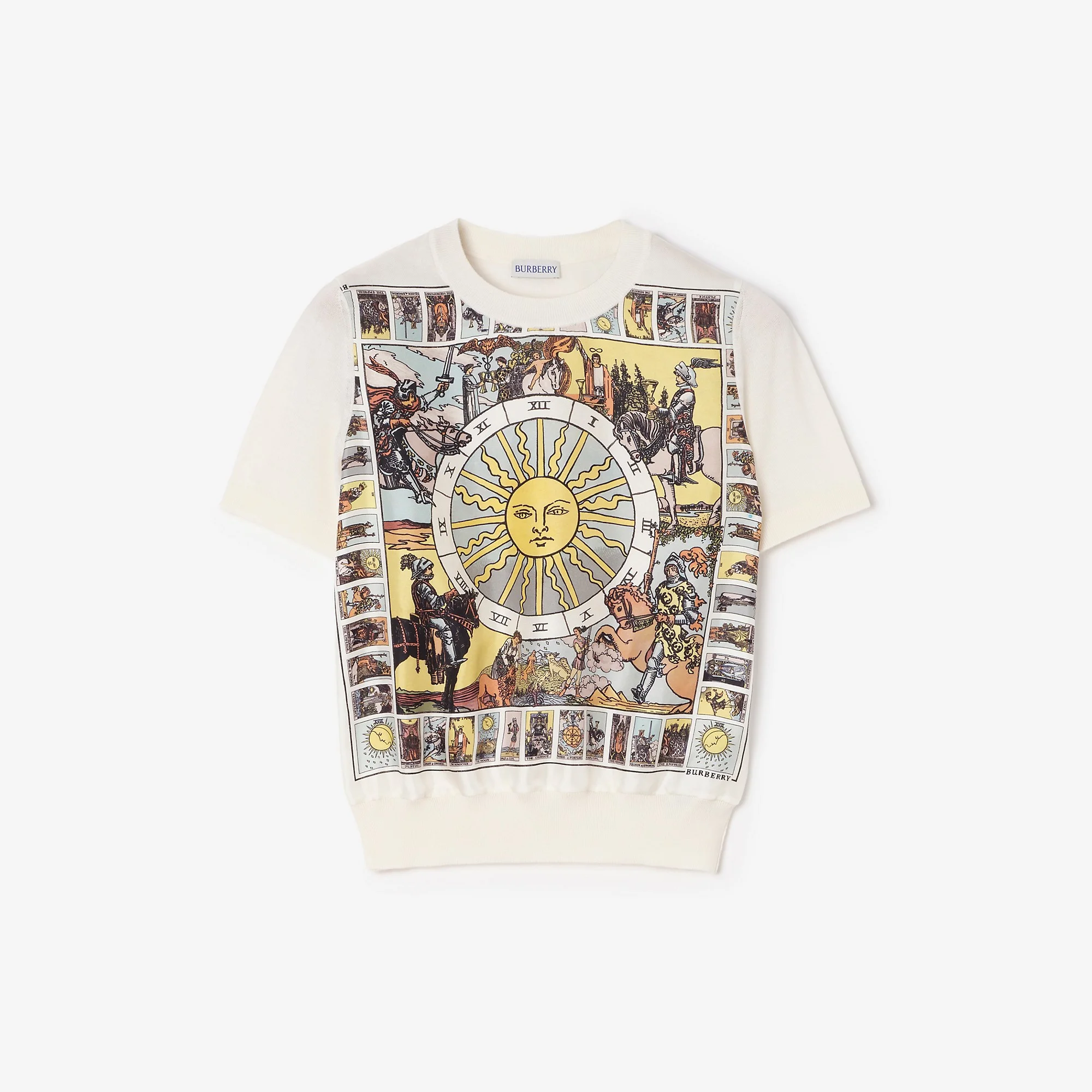 Product Details Regular fit. Fits true to size, take your normal size. A short-sleeved top in lightweight wool silk, cut for a regular fit. Reimagining Edwardian tarot cards, the crew-neck style features a silk twill panel printed with esoteric designs inspired by British artist Pamela Colman Smith. - Item 81263511 Size & Fit - Regular fit. Fits true to size, take your normal size. - Length: 55cm/21.7in (size UK S) - Model’s height: 175cm/5ft 9in. Model wears size UK S Fabric & Care - 73% wool, 27% silk - Panel: 100% silk - Trim: 62% wool, 23% silk, 11% polyamide, 4% elastane - Specialist dry clean - Made in Italy