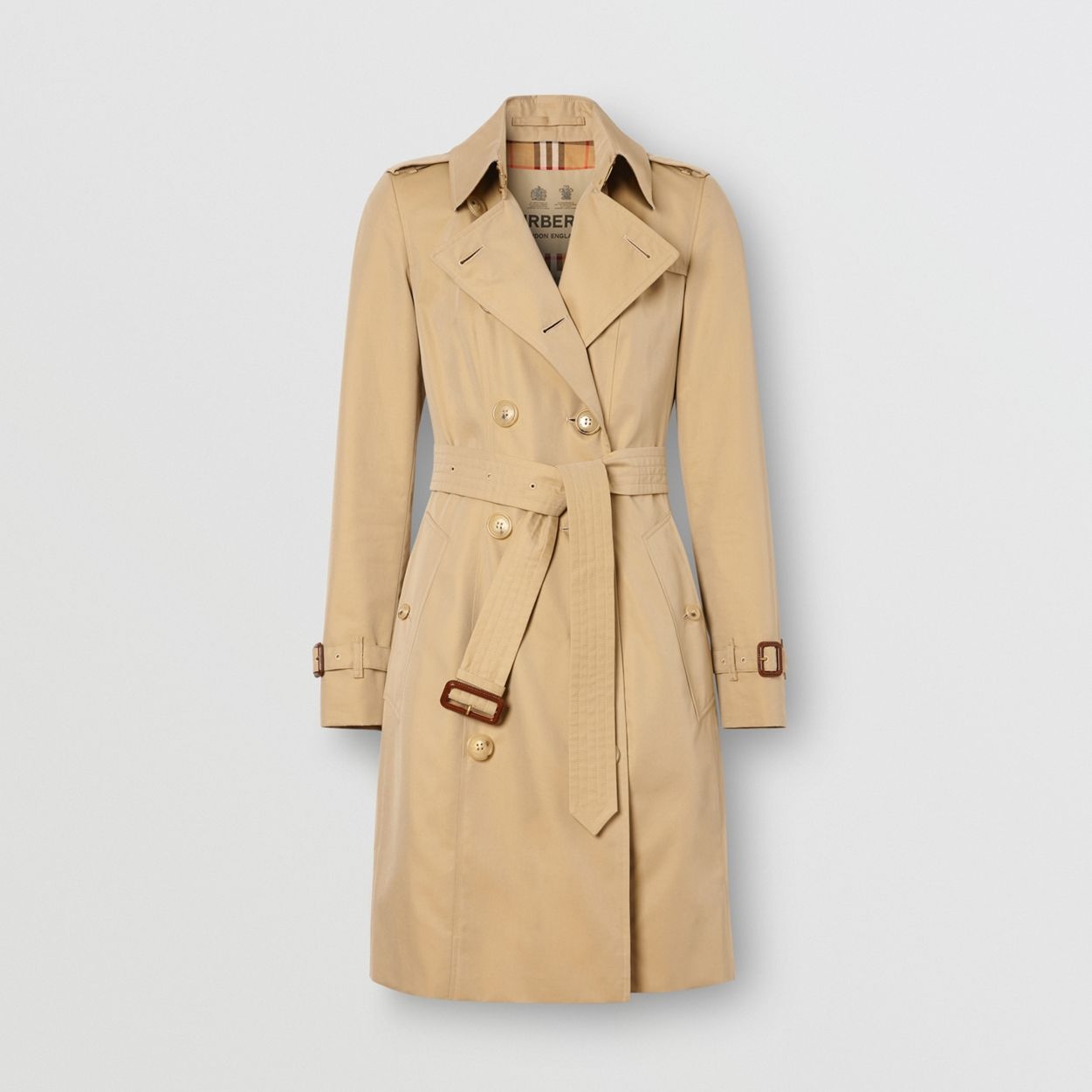 PRODUCT DETAILS Our slimmest trench coat, with narrow shoulders and a nipped-in waist. The fitted archive-inspired style is woven in our signature gabardine with a Vintage check lining. Wear it belted to accentuate the softly flared silhouette. Please note, the buttons may vary from the style photographed. Coat length: 94.5cm/37.2in. This is based on a size UK 6 as proportions change slightly according to size. Model’s height: 179cm/5ft 10in. Model wears size UK 6. Outer: 100% cotton Lining: 100% cotton Sleeve lining: 100% viscose Buttons: bioplastic (100% casein plastic) Buckles: calf leather Double-breasted closure Button-through welt pockets Signature details: epaulettes, hook-and-eye collar closure, gun flap, belted cuffs, D-ring belt, check undercollar, storm shield Specialist dry clean Made in England Alterations can be made using our in-store service. Please see FAQs for details. 80279931