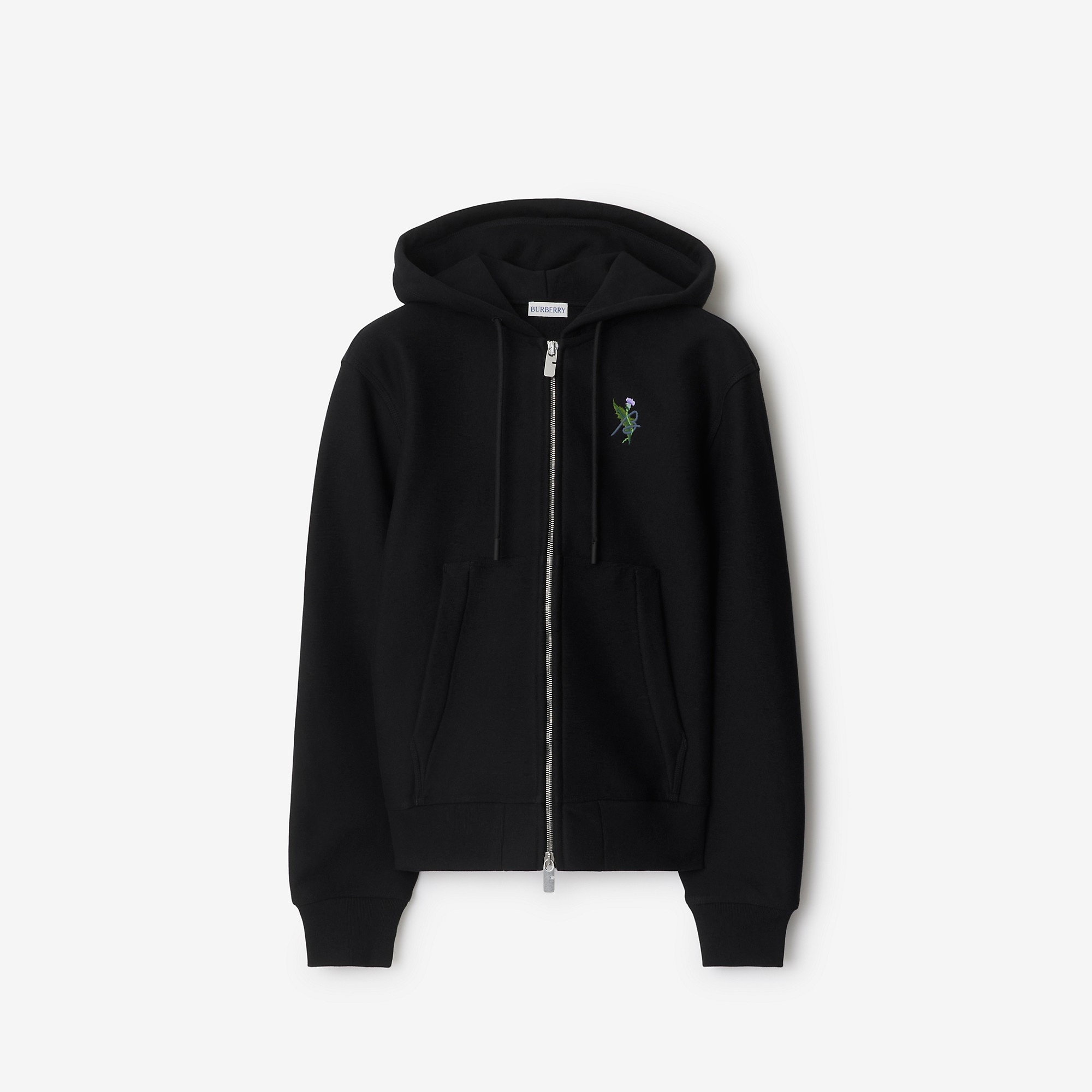 Product Details A zip hoodie in a midweight cotton blend with an embroidered logo and thistle wreath, inspired by an archive design from 1988. The style is cut to a relaxed fit and features B cut-zip pulls. - Two-way zip closure - Drawcord hood - Pouch pockets - Rib-knit trims - Embroidered Burberry lettering at back - Relaxed fit: a looser cut than our regular fit. Consider taking a size down. - Machine wash - Item 80982181 Size & Fit - Length: 62cm/24.4in (size UK S) - Model’s height: 176cm/5ft 9in. Model wears size UK S Fabric & Care - 94% cotton, 6% polyester - Trim: 99% cotton, 1% elastane - Made in Portugal