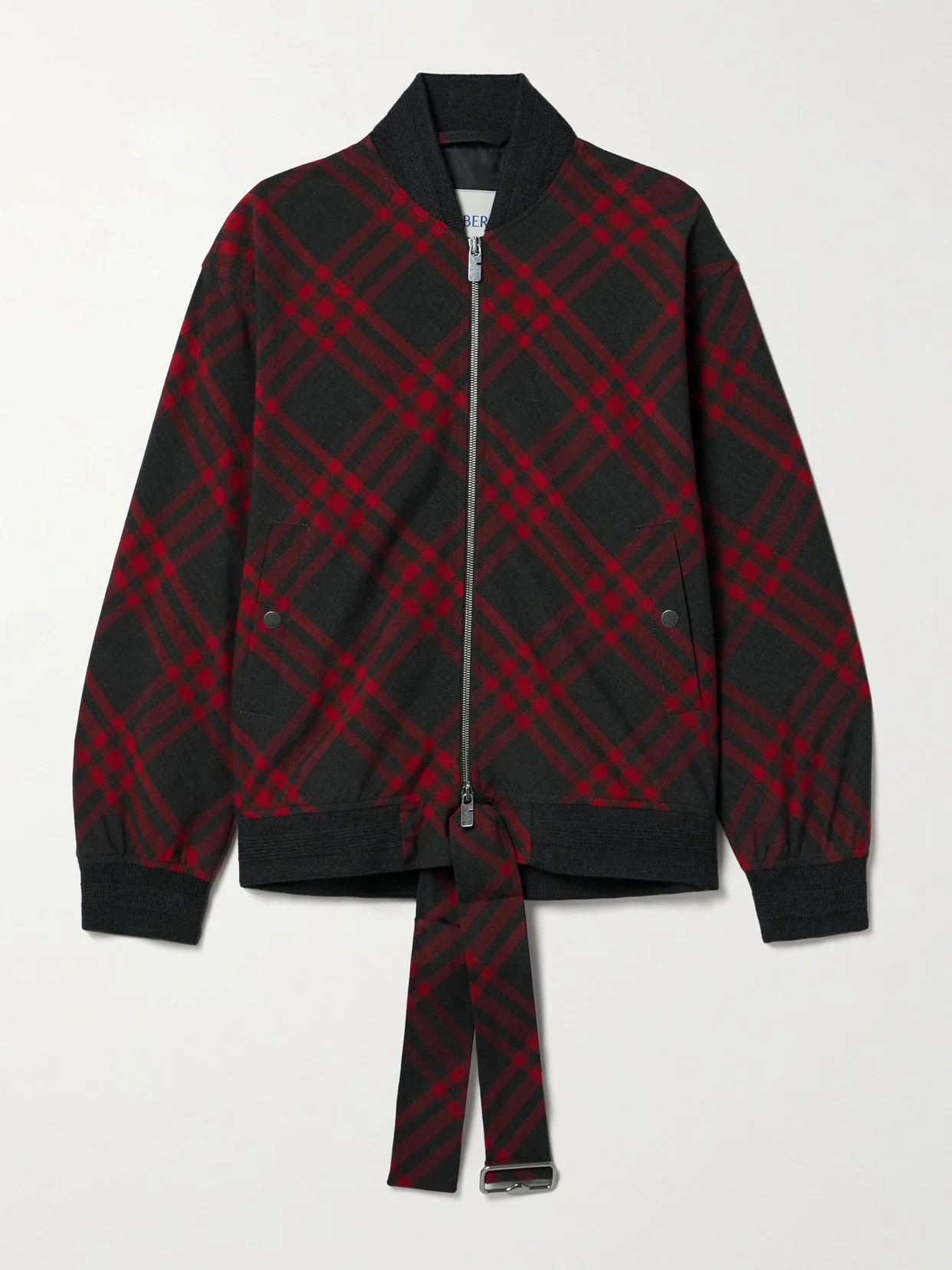Burberry's jacket is woven with a fresh red and black version of house's iconic checks, which also decorates the coordinating midi skirt. Modeled after classic bomber styles, it has a relaxed shape with adjustable ties at the hem and a smooth satin lining.