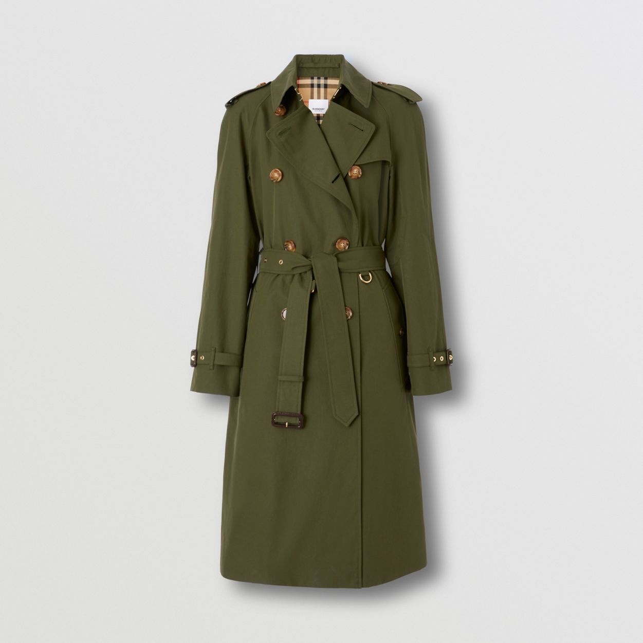 PRODUCT DETAILS A signature trench coat cut to our Waterloo fit, updated in tropical gabardine woven at the Burberry mill in Yorkshire. The style is finished with a Vintage check lining and undercollar. Regular fit Coat length: 105cm/41.3in. This is based on a size UK 6 as proportions change slightly according to size. Model’s height: 180cm/5ft 11in. Model wears size UK 6. Outer: 100% cotton Lining: 100% cotton Sleeve lining: 100% viscose Buckles: calf leather Double-breasted closure Button-through welt pockets Back button-through vent Signature details: epaulettes, hook-and-eye collar closure, gun flap, belted cuffs, D-ring belt, check undercollar, storm shield Specialist dry clean Made in England 80543281