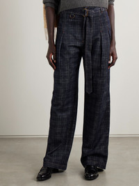 Belted pleated cotton-tweed wide-leg pants Navy