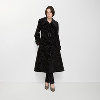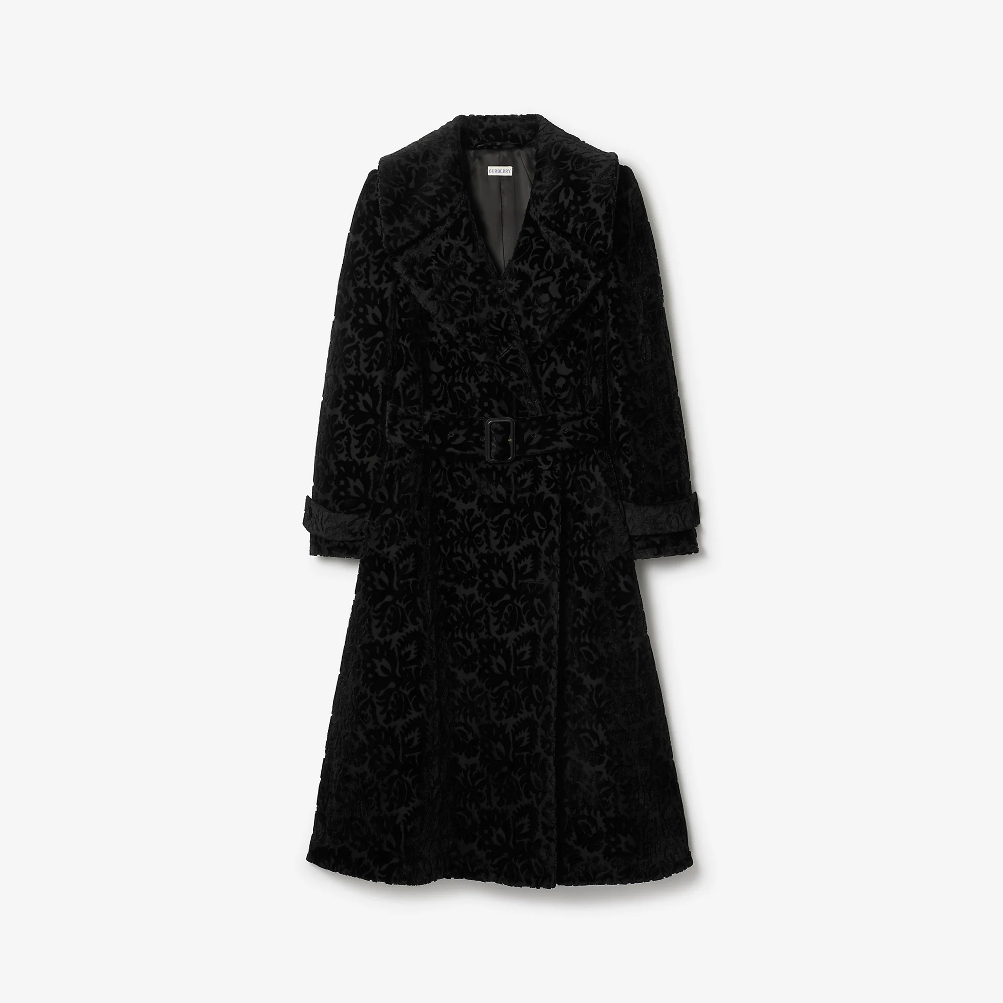 Product Details A coat made in Italy from silk blend velvet, jacquard-woven with intertwining flora and fauna. The textural fabric is inspired by the richly furnished interiors of great country houses. Debuted on the Burberry Winter 2025 runway, the style is tailored to an A-line silhouette with a slim, belted waist and fuller skirt. - Double-breasted button closure - B buckle belt - Side welt pockets - Button-tab cuffs - Fully lined, padded shoulder - Comes with a garment bag - Slim fit: this style is cut to a fitted silhouette. Fits true to size, take your normal size. - Item 81158981 Size & Fit - Length: 115cm/45.3in (size UK 8) - Model’s height: 175cm/5ft 9in. Model wears size UK 8 Fabric & Care - Outer: 62% silk, 38% cotton - Lining: 100% viscose - Pocket lining: 100% cotton - Specialist dry clean - Made in Italy