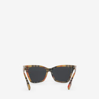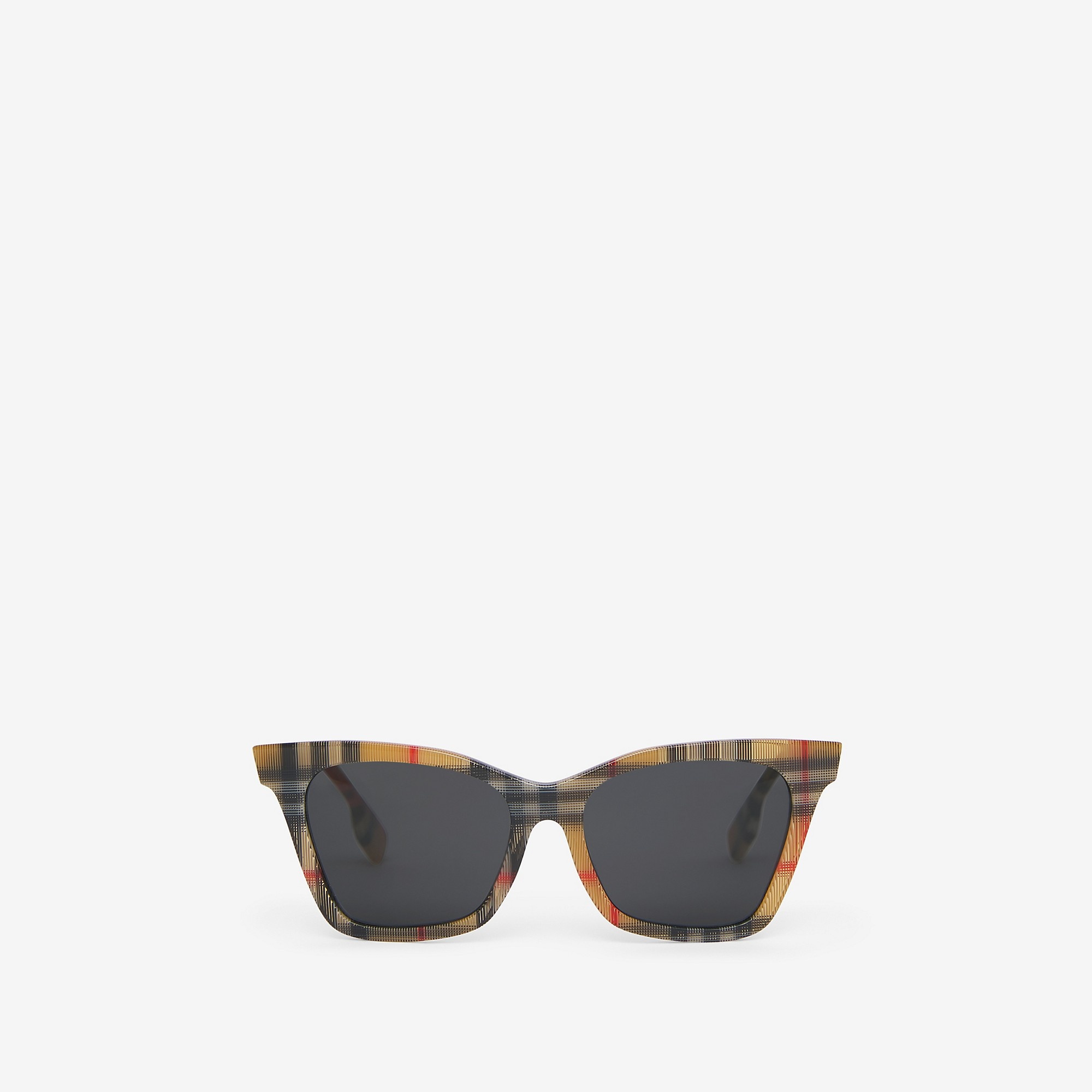 PRODUCT DETAILS An angular frame in Vintage check acetate with tonal lenses. - Frame width: 14.7cm/5.8in - Frame height: 5cm/2in Acetate frame Scratch-resistant dark grey lenses with 100% UV protection Printed Burberry lettering on the lens Made in Italy Comes with a hard leather case and cleaning cloth Item 40820941