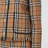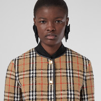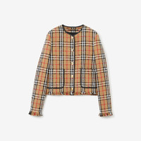 PRODUCT DETAILS A collarless bouclé jacket woven in a cotton and wool blend, animated with our Vintage Check. The design is highlighted with supple leather trims, logo-engraved press studs and delicate eyelash fringing. - Jacket length: 55cm/21.7in. This is based on a size UK 6 as proportions change slightly according to size. - Model’s height: 180cm/5ft 11in. Model wears size UK 6. Relaxed fit Outer: 87% cotton, 8% wool, 5% polyamide Trim: 100% lambskin Lining: 100% cupro Press-stud closure Patch pockets Specialist dry clean with any solvent except perchloroethylene Imported Item 80653091