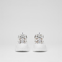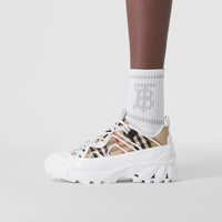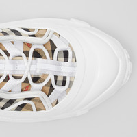 PRODUCT DETAILS Introducing our new runway sneaker crafted in Vintage check cotton and leather. The style is capped with a polished overshoe inspired by rain boots and a cross-detailed tread referencing our iconic check. Upper: 93% cotton, 7% calf leather Lining: 72% polyester, 17% sheep leather, 11% goat suede Sole: 100% polyurethane Lace-up closure Embossed Burberry lettering at heel Made in Italy Item 80394401