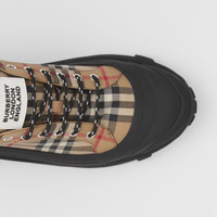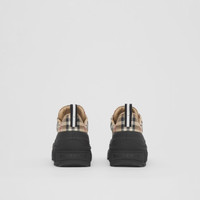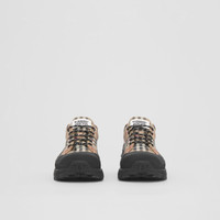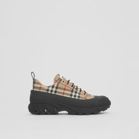 PRODUCT DETAILS Our runway sneaker crafted in Vintage check cotton. The style is capped with a matte overshoe inspired by rain boots and a cross-detailed tread referencing our iconic check. Upper: 99% cotton, 1% calf leather Trim: 70% polyamide, 30% polyester Lining: 100% goat suede; 93% sheep leather, 7% goat suede Sole: 100% polyurethane Lace-up closure Silicone patch with raised Burberry lettering at tongue, embossed Burberry lettering at heel Made in Italy 80452871