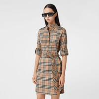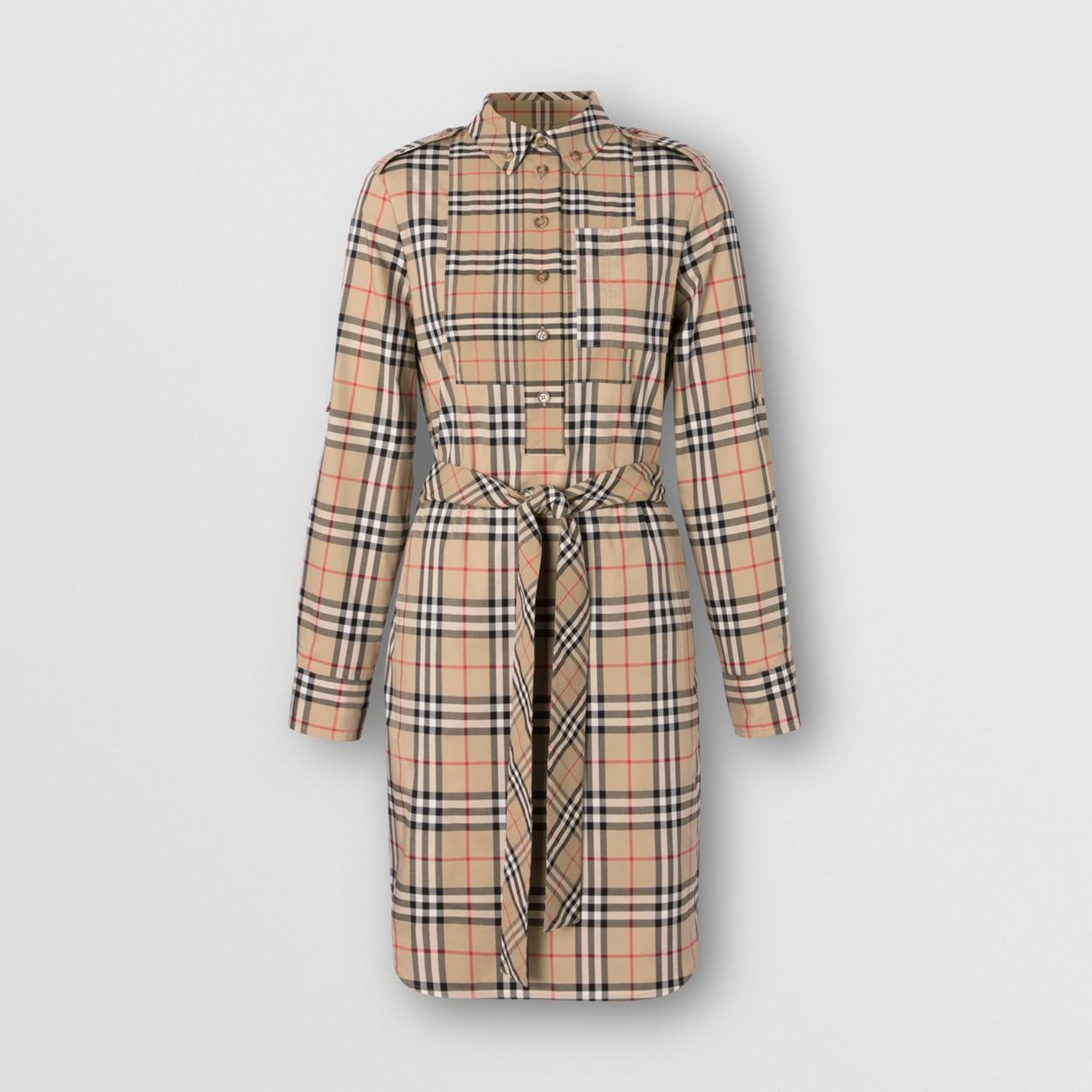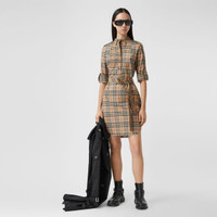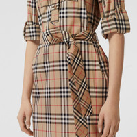 PRODUCT DETAILS A fitted shirt dress in Vintage check stretch cotton, featuring a small-scale check bib. The design is detailed with a button-down collar and button-tab sleeves. Knot the belt for a defined waist. Dress length: 97cm/38.2in. This is based on a size UK 8 as proportions change slightly according to size. Model’s height: 180cm/5ft 11in. Model wears size UK 6. 95% cotton, 5% elastane Long sleeves with buttoned cuffs Button closure Side slip pockets Self-tie belt Curved hem Machine wash Imported 80295351