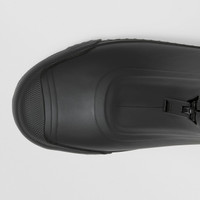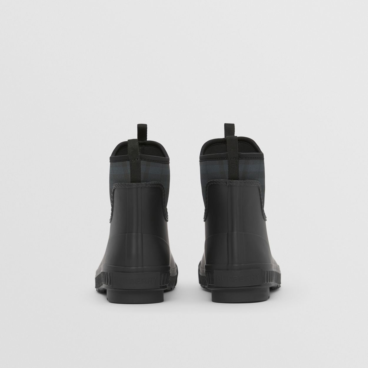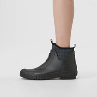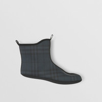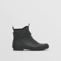 PRODUCT DETAILS A rubber rain boot reinterpreted with a removable Vintage check neoprene sock and a decorative front zip. Please note, due to its patchwork design the placement of checks may vary slightly to the garment shown. Upper: 70% rubber, 30% polyester Lining: 100% polyester Sole: 100% rubber Heel: 100% rubber Slip-on style with pull tabs Printed Burberry lettering at heel Imported Burberry has created this product using high-quality natural rubber. To clean, wipe with a damp cloth or wash with lukewarm, soapy water. Do not use solvents Over time there may be a release of protective wax, leaving a fine white deposit. This is normal and does not affect the quality of the boots. To remove, please wipe boots with a damp cloth. Store out of direct sunlight in a cool, dry location away from extreme sources of heat or cold and avoid contact with dark or bright items. 80458351