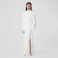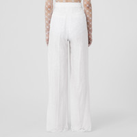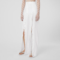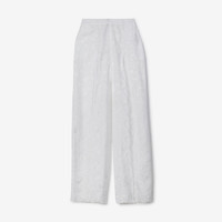 PRODUCT DETAILS Wide-leg trousers in crinkled viscose, jacquard-woven with a seasonal floral design. The silhouette is styled with exaggerated front splits edged with lace. The design is part of the Burberry Spring/Summer 2023 runway collection. - Trouser inside leg length: 81.5cm/32in. This is based on a size UK 6. - Model’s height: 180cm/5ft 11in. Model wears size UK 6. Outer: 100% viscose Trim: 92% cotton, 8% viscose Lining: 100% viscose Concealed hook-and-bar, button and zip fly closure Side slip pockets, back welt pockets Specialist dry clean Made in Italy Item 80683641