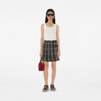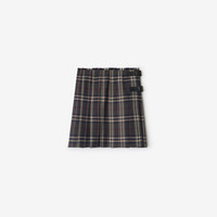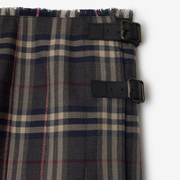 Product Details A mini kilt made from wool woven with the Burberry Check. The A-line silhouette is tailored with pleats and can be adjusted with the calf leather B buckle straps. - Side button and B buckle closure - Eyelash fringing at the waistband - Engraved Burberry lettering at buckles - Item 81104271 Size & Fit - Length: 43.5cm/17.1in (size UK 8) - Model's height: 175cm/5ft 9in. Model wears size UK 8 Fabric & Care - 100% wool - Trim: 100% calf leather - Buttons: buffalo horn - Specialist dry clean - Imported