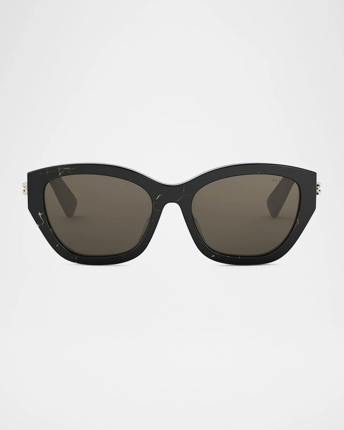 BVLGARI cateye sunglasses crafted of marbleized acetate From the B.zero1 line Eye/bridge/temple (in mm): 5618140 Monochromatic lenses Saddle nose bridge Lasered logo on temples' detail Underlaquer metal logo inside the right temple Wide, tapered arms Acetate Hand wash 100% UVA/UVB protection Made in Italy