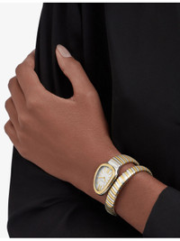 PRODUCT DETAILS - Bvlgari 18ct yellow-gold, stainless steel and brilliant-cut diamond quartz watch - 100% 18ct yellow gold; 100% stainless steel - 38 diamonds - Moulds to wrist - Style number: BR858992 - Spiral case, white opaline dial with guilloche soleil treatment, hand-applied indexes, set with a cabochon-cut pink rubellite, Roman numeral indexes at 12 and 6, calibre B033, polished finish - Case diameter: 35mm - Wipe with a clean, dry cloth - Made in Switzerland - Two-year manufacturer's warranty - Please refer to the brand’s care instructions - Bvlgari prides itself on providing excellent customer service. This includes contacting customers to offer after-sales care and share details about its brand and products. As such, when you order a Bvlgari product from us, your details will be passed onto Bvlgari so that it can provide these services to you. - To learn more about this product or for expert styling services, get in touch with our Personal Shopping team Ref: R03993271