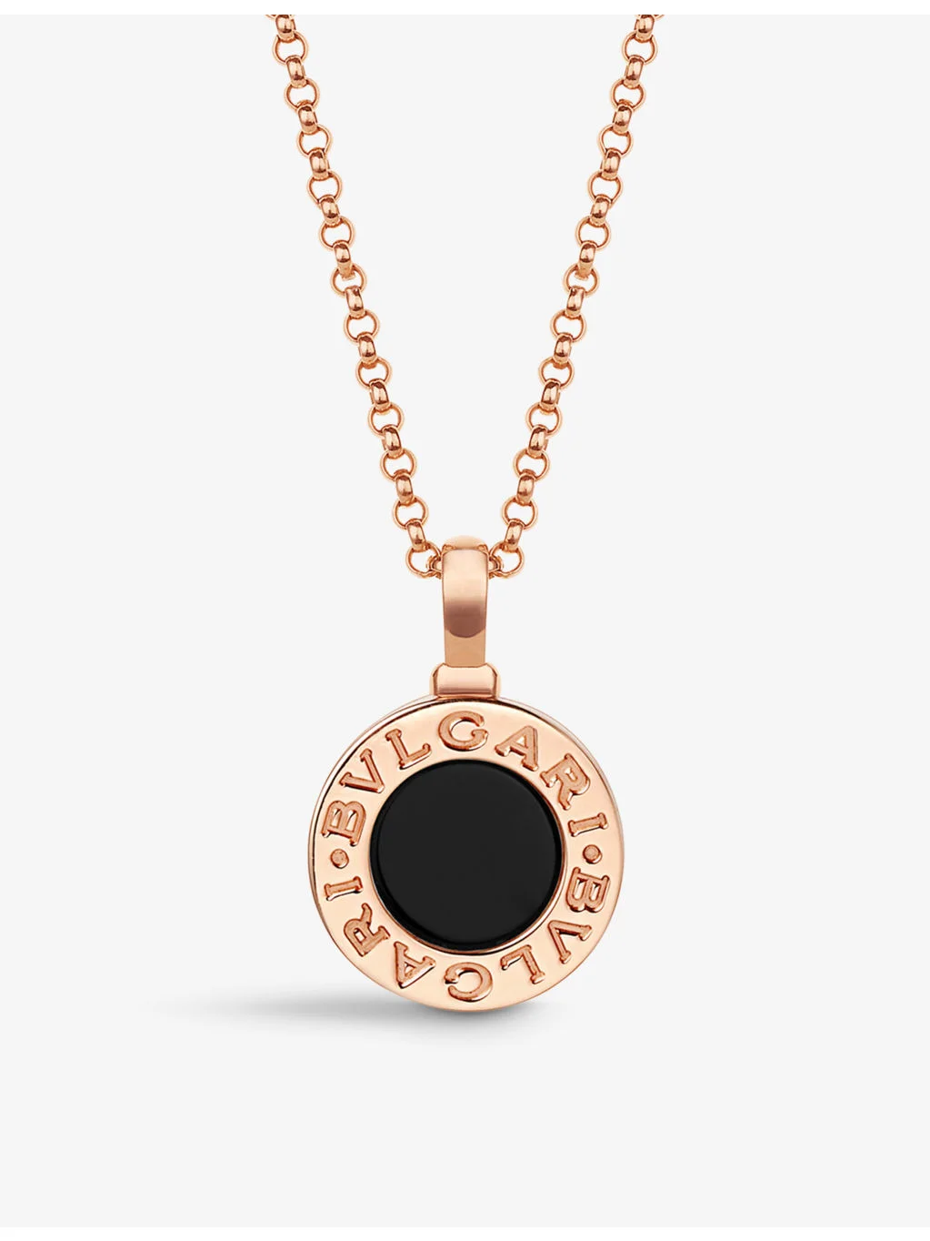 PRODUCT DETAILS - Bvlgari 18ct rose-gold and onyx necklace - 100% 18ct rose gold, 100% onyx - Lobster-clasp fastening - Cable chain, circular pendant set with onyx, brand engraving, polished finish - Chain length: 41 - 43cm - Please use a soft, dry polishing cloth - Made in Italy Ref: R04212475