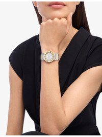 PRODUCT DETAILS - Bvlgari Bvlgari Bvlgari 18ct Yellow-Gold, Stainless-Steel And Diamond Quartz Watch - Case material: 100% stainless steel - Crown: 100% 18ct yellow gold set with a cabochon-cut pink rubellite - Strap: 100% stainless steel, 100% 18ct yellow gold - Bezel: 100% 18ct yellow gold bezel engraved with double logo - Style Number: 7612902173442 - Movement type: quartz - Fastening: folding buckle - Dial: white mother-of-pearl mosaic dial - Hands: yellow gold-plated hands - Index: 12 round brilliant-cut diamond indexes - Glass: synthetic sapphire - Stones: 12 round brilliant-cut diamonds, cabochon-cut pink rubellite - Calibre: B043 - Case dimensions: 33mm - Technical details: hours and minutes functions - Water resistance: 30m - Warranty: 5 years - Made in: Switzerland - Care: please refer to the brand's instructions - Bvlgari prides itself on providing excellent customer service. This includes contacting customers to offer after-sales care and share details about its brand and products. As such, when you order a Bvlgari product from us, your details will be passed onto Bvlgari so that it can provide these services to you. Ref: R04550079