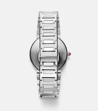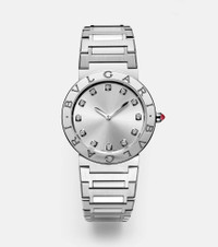 An exquisite example of Bvlgari's creativity and craftsmanship, the Bvlgari Bvlgari Lady watch was the very first watch to use a logo as an element of design. It's made from stainless steel with a 33mm diameter and up to 30m water resistance. It's finished with brilliant-cut diamond indexes, circular logo bezel engraving, and a cabochon-cut rubellite on the crown. Product Details - Watch type: quartz - Shape: round - Case material: stainless steel - Strap material: stainless steel - Made in Switzerland - Bezel: engraved - Case diameter: 33 mm / 1.29 inches - Water resistance: up to 30 BAR / 30 ATM / 300m / 990ft - Stone I: diamonds, brilliant-cut, 0.2ctw - Stone II: rubellite, cabochon-cut - Item number: P01030181 Size & Fit - Adjustable size - Height 0,6cm-0" - Min. width 1,3cm-0.5" - Max. width 3,6cm-1.5" - Circumference 17,5cm-7" - Case diameter: 2,6cm-1"