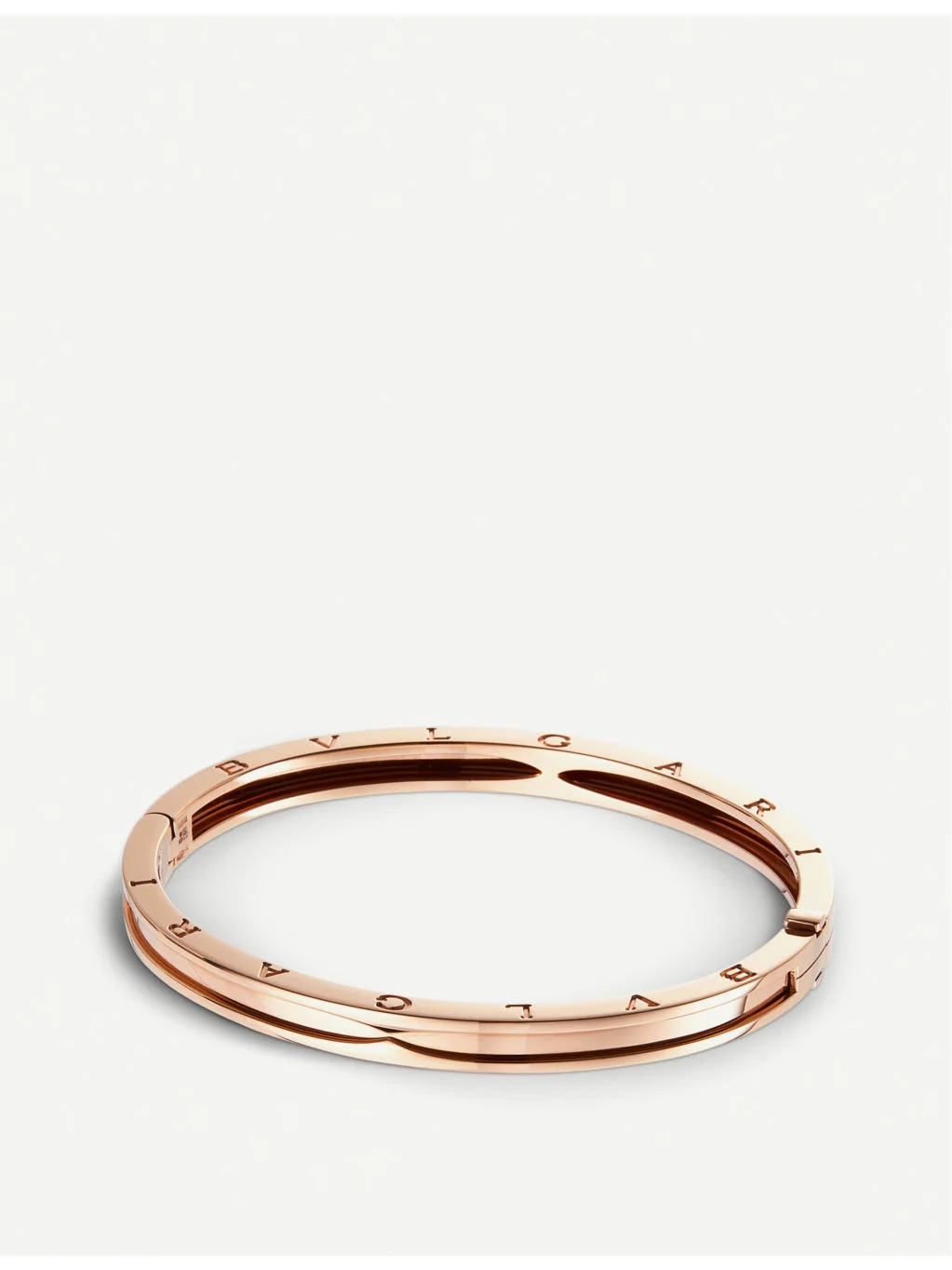 PRODUCT DETAILS - Bvlgari 18ct rose-gold bangle bracelet - 100% 18ct rose gold - Hinge-clasp fastening - Stepped surface, brand engraving, polished finish - Dimensions: 17cm - Made in Italy - Please use a soft, dry polishing cloth Ref: R03992268