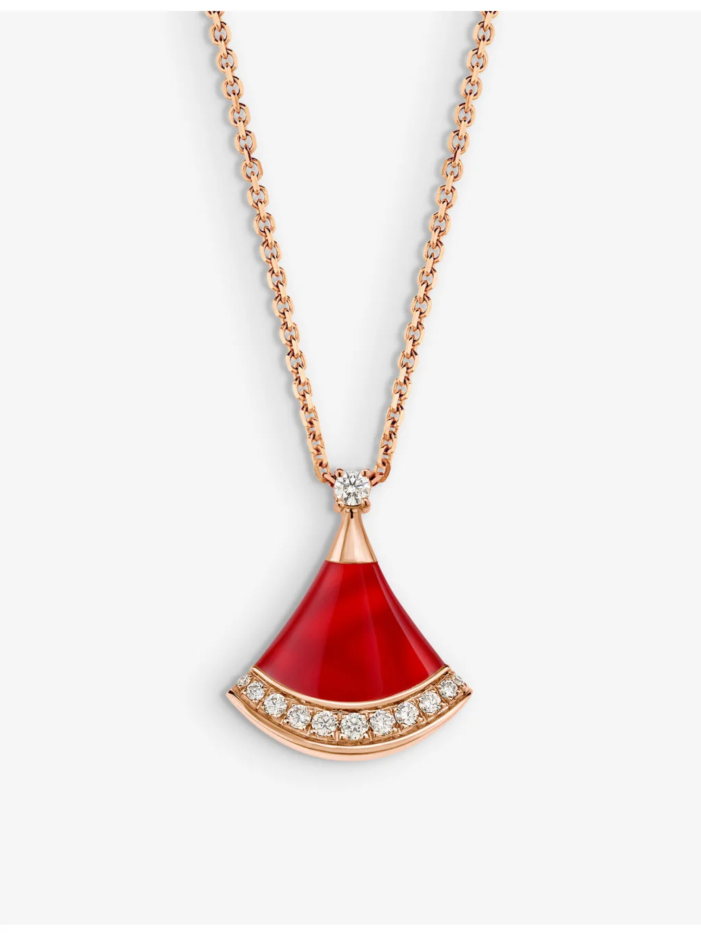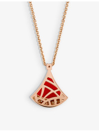 PRODUCT DETAILS - Bvlgari 18ct rose-gold, 0.13ct brilliant-cut diamond and carnelian pendant necklace - 100% 18ct rose gold - 12 diamonds, 1 carnelian - Lobster-clasp fastening - Polished finish, pave-set stones, fan motif with carnelian insert - Carat weight: diamond 0.13ct - Carat cut: round brilliant - Carat clarity: IF-VS - Carat colour: D-G - Chain type: cable chain - Pendant height 1.5cm - Made in Italy - Please use a soft, dry polishing cloth - Five-year manufacturer's warranty - Bvlgari prides itself on providing excellent customer service. This includes contacting customers to offer after-sales care and share details about its brand and products. As such, when you order a Bvlgari product from us, your details will be passed onto Bvlgari so that it can provide these services to you. Ref: R04265232