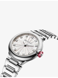 PRODUCT DETAILS - Bulgari RE00006 Lvcea stainless-steel and 0.22ct diamond automatic watch - 100% stainless steel - 12 diamonds - Style number: RE00006 - Folding-buckle fastening - Automatic movement, hours, minutes and seconds functions, white mother-of-pearl intarsia marquetry dial, diamond indexes, stainless steel crown set with a synthetic cabochon-cut rubellite and a diamond, polished and satin-brushed stainless steel bracelet - Carat: 0.22ct - Cut: round brilliant - Dial: round - Glass: synthetic sapphire - Case diameter: 33mm - Water resistance: more than 5 bar / 5 atm / 50m - Made in Switzerland - Please refer to the brand’s care instructions - Five-year warranty