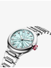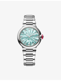 PRODUCT DETAILS - Bvlgari stainless-steel, 0.2200ct brilliant-cut diamond and mother-of-pearl automatic watch - 100% stainless steel; 12 diamonds - Carat weight: 0.2200ct - Carat cut: round brilliant - Style number: RE00007 - Folding-buckle fastening - Round dial, automatic movement, sapphire-crystal glass, diamond indexes, B77 calibre, hours, minutes and seconds functions, polished case, mother-of-pearl intarsia marquetry dial, stainless-steel crown set with a synthetic cabochon-cut rubellite and a diamond, polished and satin-brushed stainless-steel bracelet with folding buckle - Case diameter: 33mm - Wipe with a clean, dry cloth - Water resistance: 5 bar / 5 atm / 50m / 165ft - Made in Switzerland - Five-year manufacturer's warranty