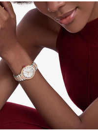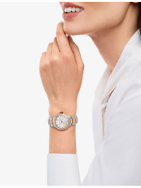 PRODUCT DETAILS - Bvlgari RE00009 Lvcea 18ct rose-gold, stainless-steel and 0.22ct diamond automatic watch - 100% 18ct rose gold, 100% stainless steel - 12 diamonds - Style number: RE00009 - Folding-buckle fastening - Automatic movement, white mother-of-pearl marquetry dial and 12 diamond indexes, hours, minutes and seconds functions, crown set with a synthetic cabochon-cut rubellite, calibre B77 - Carat: 0.22ct - Cut: round brilliant - Dial: round - Glass: synthetic sapphire - Case diameter: 33mm - Water resistance: more than 5 bar / 5 atm / 50m - Made in Switzerland - Please refer to the brand’s care instructions - Five-year warranty - Bvlgari prides itself on providing excellent customer service. This includes contacting customers to offer after-sales care and share details about its brand and products. As such, when you order a Bulgari product from us, your details will be passed onto Bulgari so that it can provide these services to you - To learn more about this product or for expert styling services, get in touch with our Personal Shopping team Ref: R04312668