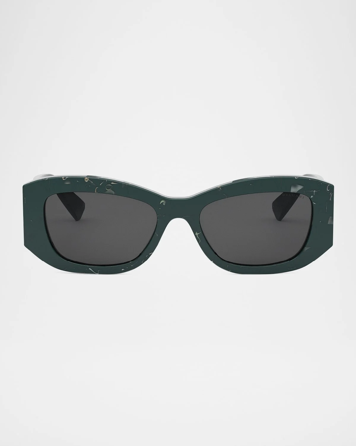- BVLGARI "Roma" rectangle sunglasses in acetate and nylon with lasered logo metal plaque - Lens/bridge/temple (in mm): 54-18-145 - Solid lenses - Logo on left lens - Saddle nose bridge - Wide, tapered arms - 100% UVA/UVB protection - Made in Italy - Proposition 65 warning for California residents - This product contains perfluoroalkyl and polyfluoroalkyl substances (PFAS). For more information, please visit the manufacturer’s website.