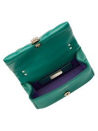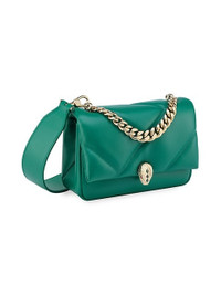 The geometric maxi matelassé pattern, inspired by the sinuous surface of cabochon-cut gemstones, adds texture to BVLGARI's leather bag. This piece is adorned with the Serpenti head closure finished with mother-of-pearl scales and enamel eyes. The Serpenti collection is inspired by the snake’s ability to endlessly change its skin. - Chain handle - Removable leather strap - Snap closure - Interior main compartment - Interior slip pocket - Calf leather - Leather lining - Made in Italy SIZE - 6.5"W x 4.75"H x 2"D