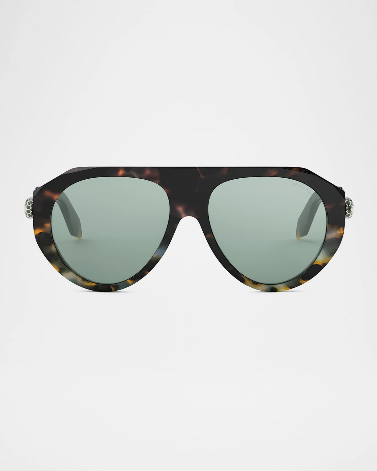 - BVLGARI "Serpenti Forever" aviator sunglasses in acetate - Lens/bridge/temple (in mm): 56-16-140 - Gradient lenses; logo on corner - Saddle nose bridge - Logo on temples - Thin, tapered arms - Acetate - 100% UVA/UVB protection - Made in Italy - Proposition 65 warning for California residents