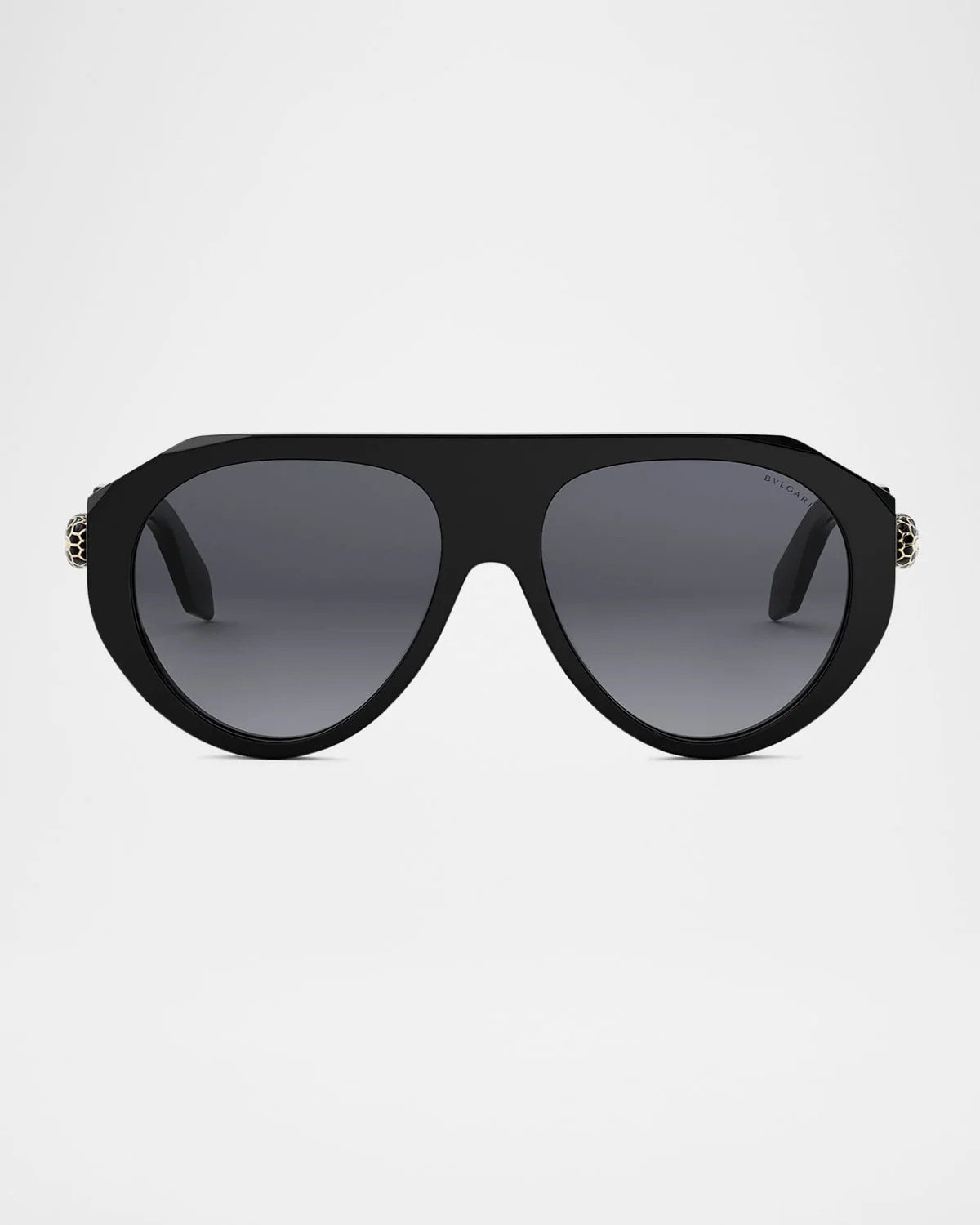 - BVLGARI "Serpenti Forever" aviator sunglasses in acetate - Lens/bridge/temple (in mm): 56-16-140 - Gradient lenses; logo on corner - Saddle nose bridge - Logo on temples - Thin, tapered arms - Acetate - 100% UVA/UVB protection - Made in Italy - Proposition 65 warning for California residents