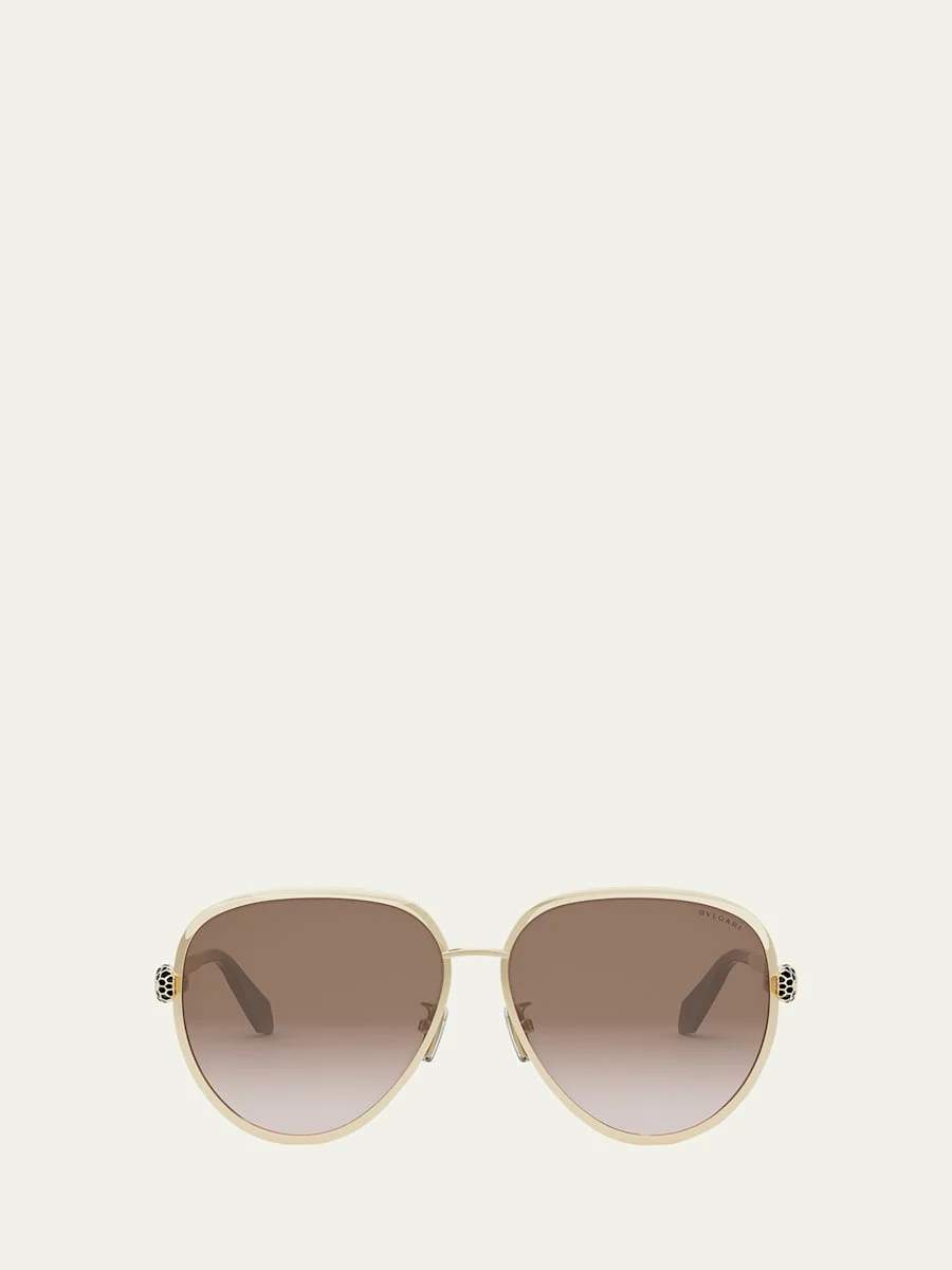 BVLGARI sunglasses in metal Lasered logo on metal temples, and on lens Eye/bridge/temple (in mm): 54.1-13-140 Eyewear style: Aviator Metal 100% UVA/UVB protection Made in Italy Proposition 65 warning for California residents Online Inquiries: BGS21_D5528| Store Inquiries: #4972558