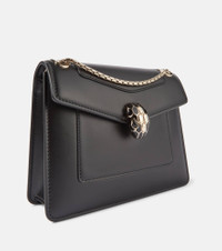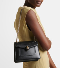 Bvlgari’s Serpenti Forever Day-to-Night shoulder bag is an ode to their iconic jewels of the ‘60s. The design is crafted in Italy from leather with internal and external pockets and is complete with an attached mirror. The style features a snake-like chain strap and the brand’s archetypal snakehead closure. Product Details - Material: calf leather - Lining: leather (nappa) - Made in Italy - Designer color name: Black - Internal details: single compartment, internal slot pockets, hand-held mirror - Chain shoulder strap - Closure: magnetic fastening - Hardware color: gold - Item number: P01031987 Size & Fit - Height 15cm-6" - Min. width 18cm-7" - Max. width 19cm-7.5" - Depth 6cm-2.5" - Length of handles 63cm-25" - Length shoulder strap 112cm-44"