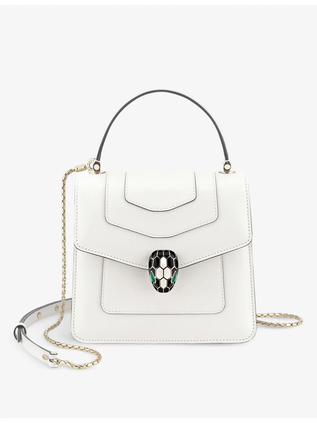 PRODUCT DETAILS - Bvlgari leather top-handle bag - 100% leather - Magnetic fastening - Serpenti head, gold-plated hardware, top handle, three gussets, removable chain strap, internal pocket, exterior pocket - Dimensions: Height 18cm, width 15cm, depth 9.5cm - Specialist leather clean - Made in Italy - Bvlgari prides itself on providing excellent customer service. This includes contacting customers to offer after-sales care and share details about its brand and products. As such, when you order a Bulgari product from us, your details will be passed onto Bulgari so that it can provide these services to you