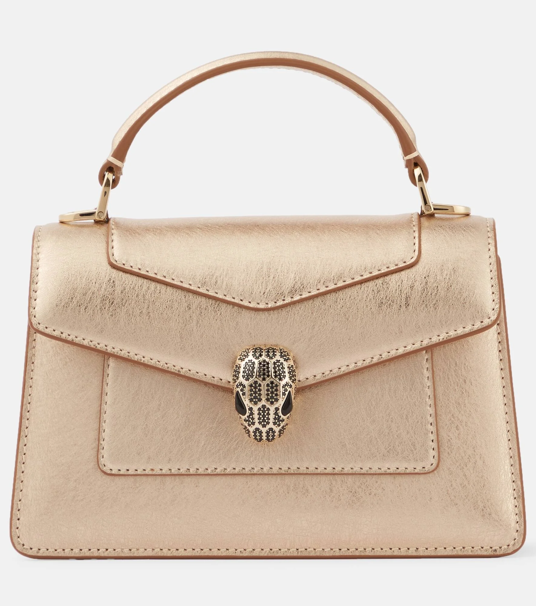 The Serpenti Forever Mini tote bag blends timeless elegance with practical versatility. Crafted in Italy from metallic calf leather, it features the iconic snakehead closure, a detachable chain strap, and a refined compact design. Product Details - Material: calf leather - Lining: leather (nappa) - Made in Italy - Designer color name: Light Gold - Internal details: single compartment, internal slot pockets, hand-held mirror - Top handle, Detachable chain shoulder strap - Closure: magnetic fastening - Hardware color: gold - Item number: P01031989 Size & Fit - Height 12cm-4.5" - Min. width 17cm-6.5" - Max. width 19cm-7.5" - Depth 6cm-2.5" - Length of handles 18cm-7" - Adjustable shoulder strap - Min. length shoulder strap 114cm-45" - Max. length shoulder strap 123cm-48.5"