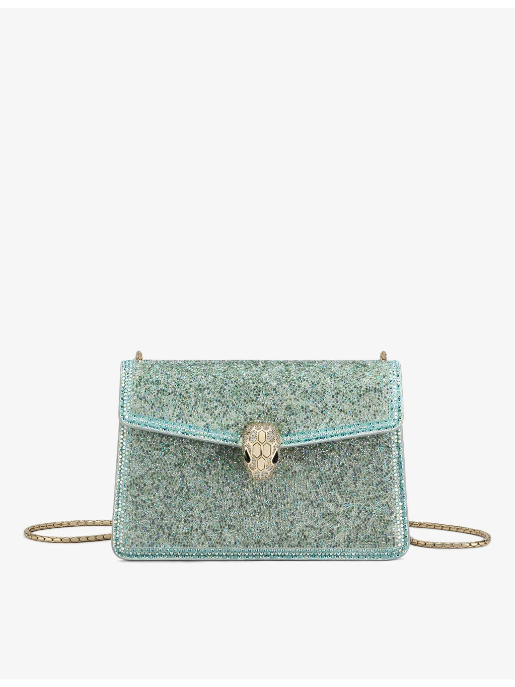 PRODUCT DETAILS - Bvlgari mini suede cross-body bag - 100% suede - Magnetic fastening - Signature snake chain strap, gold-plated brass snakehead closure, black onyx eyes, all-over different size degrade gold crystals, one main compartment, interior slip pocket, pocket mirror included, fully lined, gold-tone hardware - Height 11cm, width 17cm, depth 5cm - Specialist leather clean - Made in Italy Ref: R04262448