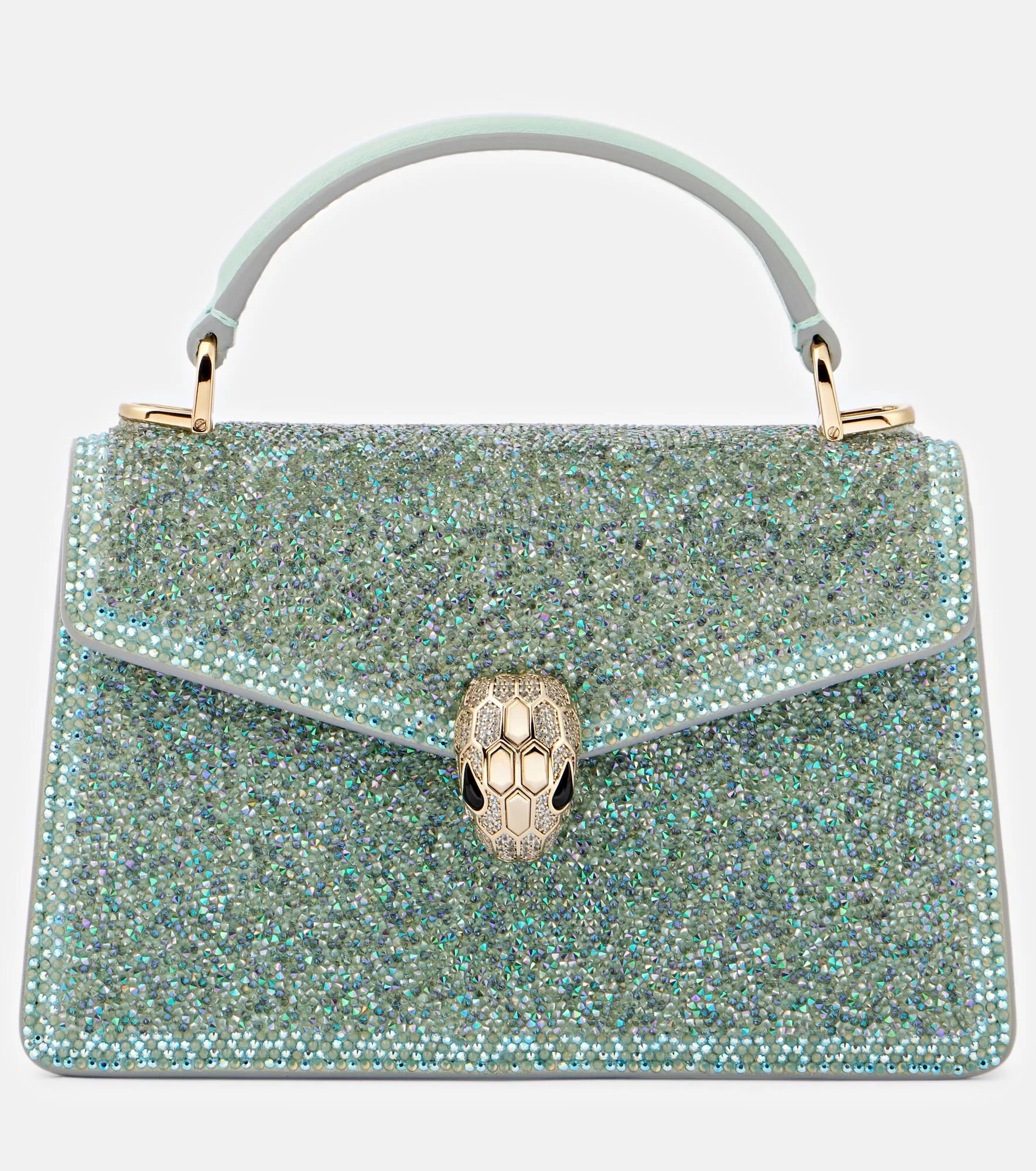 Sophisticated and dazzling, the Serpenti Forever tote bag from Bvlgari is primed to become a modern standout. Meticulously crafted from suede, the Mini style is embellished with hand-applied aquamarine crystals in different sizes. Featuring a serpentine chain and a leather strap, the piece is completed with the iconic snake head magnetic closure encrusted with pave-set zirconias. Product Details - Material: fabric - Lining: leather - Made in Italy - Designer color name: Acqumarina - Item color: blue - Item number: P01062303 Size & Fit - Height 10.5cm-4" - Width 18.5cm-7.5" - Depth 6cm-2.5" - Chain length 119cm-47" - Length of handles 19cm-7.5"