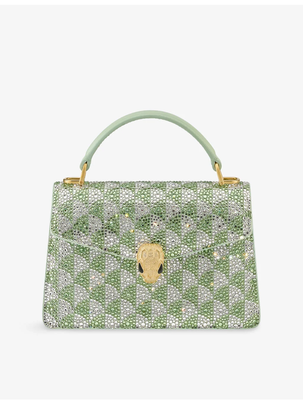 PRODUCT DETAILS - Bvlgari suede top-handle bag - 100% suede - Clasp fastening - Fold-over design, Serpenti head, top handle, chain strap, gold-toned hardware, all-over bead embellishment, main compartment, internal open pocket, mirror pocket, internal metal tag - Dimensions: Height 19cm, width 11cm, depth 5.5cm - Specialist leather clean - Bvlgari prides itself on providing excellent customer service. This includes contacting customers to offer after-sales care and share details about its brand and products. As such, when you order a Bvlgari product from us, your details will be passed onto Bvlgari so that it can provide these services to you. Ref: R04258686