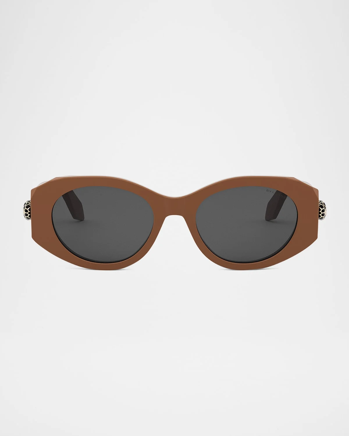 - BVLGARI "BV40007IW" oval sunglasses in acetate, metal, and nylon/polyamide - Iconic snake head positioned on shorter temples with an eye-catching front shape - Lens/bridge/temple (in mm): 63-15-140 - Saddle nose bridge - Logo on temples - Wide, tapered arms - Hand wash - 100% UVA/UVB protection - Made in Italy - Proposition 65 warning for California residents