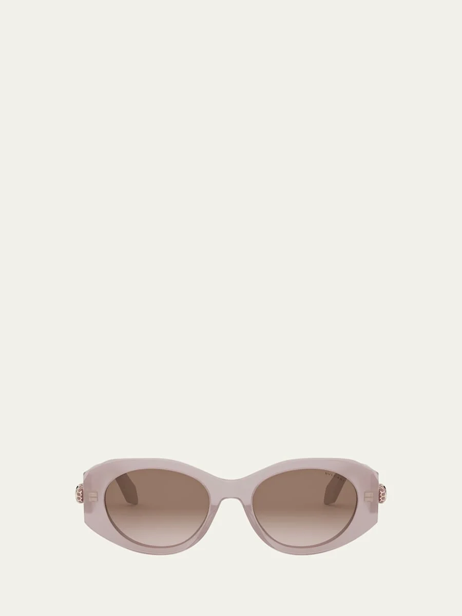 BVLGARI "Serpenti" oval sunglasses in acetate and Amni® nylon Iconic snake heads positioned on shorter temples with an eye-catching front shape Lens/bridge/temple (in mm): 52-19-140 Gradient lenses; logo on corner Saddle nose bridge Thin, tapered arms Hand wash 100% UVA/UVB protection Made in Italy Proposition 65 warning for California residents Online Inquiries: BGS21_D4W13| Store Inquiries: #4743916