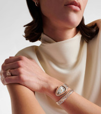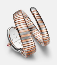 Bulgari's Serpenti Tubogas watch fuses irresistible glamour with distinctive jewelry design. It's expertly crafted with a flexible and tubular litheness from spirals of 18kt rose gold and stainless steel. It's detailed with a cabochon-cut rubellite on the crown and a white opaline dial with guilloche soleil treatment. Product Details - Watch type: quartz - Shape: ovale - Case material: stainless steel, rose gold - Strap material: stainless steel, rose gold - Made in Switzerland - Stone I: rubellite, cabochon-cut - Water resistance: up to 30 BAR / 30 ATM / 300m / 990ft - Case diameter: 35 mm / 1.37 inches - Item number: P01030168 Size & Fit - Adjustable size - Height 0,8cm-0.5" - Min. width 0,6cm-0" - Max. width 2,5cm-1" - Circumference 14cm-5.5" - Case diameter: 1,6cm-0.5"