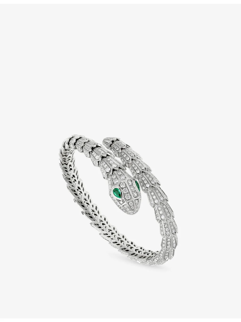 PRODUCT DETAILS - Bvlgari 18ct white-gold, 3.89ct diamond and 0.26ct emerald bracelet - 100% 18ct white gold - Diamonds, 2 emeralds - Slip-on fastening - Polished finish, serpent design, pave-set diamonds - Carat clarity: IF-VS - Carat colour: D-G - Bracelet length 15cm - Made in Italy - Please use a soft, dry polishing cloth - Two-year manufacturer's warranty - Bvlgari prides itself on providing excellent customer service. This includes contacting customers to offer after-sales care and share details about its brand and products. As such, when you order a Bvlgari product from us, your details will be passed onto Bvlgari so that it can provide these services to you. - To learn more about this product or for expert styling services, get in touch with our Personal Shopping team Ref: R04214676