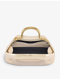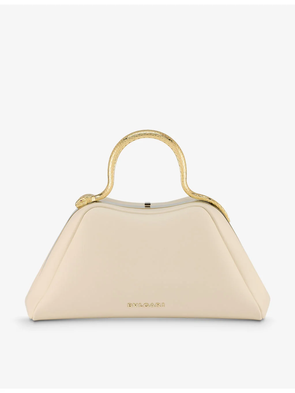PRODUCT DETAILS - Bvlgari leather top-handle bag - Calf leather - Clasp fastening - Structured design, serpent-shaped handle, logo print at front, one main compartment, one interior slip pocket, gold-tone hardware - Height 14 cm, width 27 cm, depth 10 cm - Specialist leather clean - Made in Italy