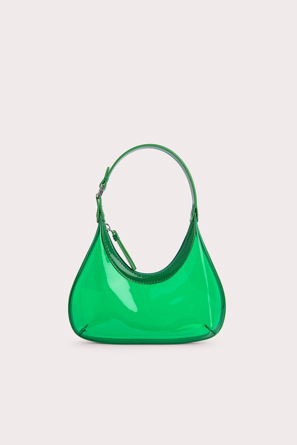 One of BY FAR's signature shoulder designs is reimagined into a mini version. Sleek, curved lines define the structured silhouette of the Baby Amber bag. The transparent body of this hobo-style top handle bag is created using PVC ECO, which is OEKO-TEX® Standard 100 certified, completed with a PU handle. Finishing touches include a zip closure and a logo-engraved buckle. DETAILS • PVC exterior • PU handle • Silver-toned, branded hardware • Zip closure • Made in Bulgaria CARE At BY FAR we carefully select all materials used for our products. Please handle with care for longer product life. • Avoid overexposure to light, heat and humidity • Avoid contact with rough and/or abrasive surfaces • Do not use solvents and excessive or prolonged rubbing, as this could damage the product • Clean with a soft, dry cloth • Store your BY FAR product in its original dust bag You can find more information at Product Care. SIZE AND FIT • Depth 6 cm • Height 11 cm • Width 24 cm • Handle Drop 17 cm • Strap Length 25 cm