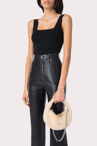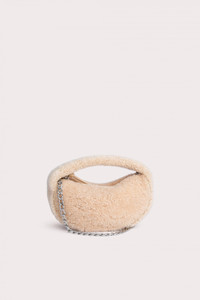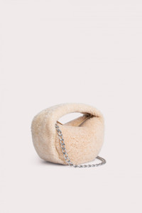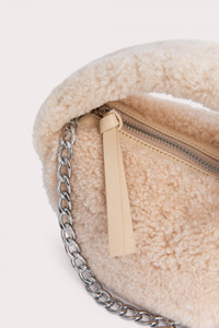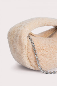 This ‘Baby Cush’ bag made of shearling is a new interpretation of the beloved BY FAR style. Characterized by a soft, rounded construction, the top-handled bag is decorated with a detachable chain strap that lets you also wear it over the shoulder. Features zip closure and cotton lining. DETAILS Lambskin leather exterior Silver-toned metal hardware Zip closure Detachable chain strap Cotton lining Made in Bulgaria CARE At BY FAR we carefully select all materials used for our products. Please handle with care for longer product life. • Avoid overexposure to light, heat and humidity • Avoid contact with rough and/or abrasive surfaces • Do not use solvents and excessive or prolonged rubbing, as this could damage the product • Clean with a soft, dry cloth • Store your BY FAR product in its original dust bag You can find more information at Product Care. SIZE AND FIT • Depth 8cm • Height 12cm • Width 22.5cm • Chain Length 56 cm