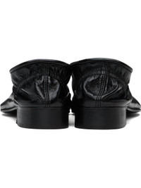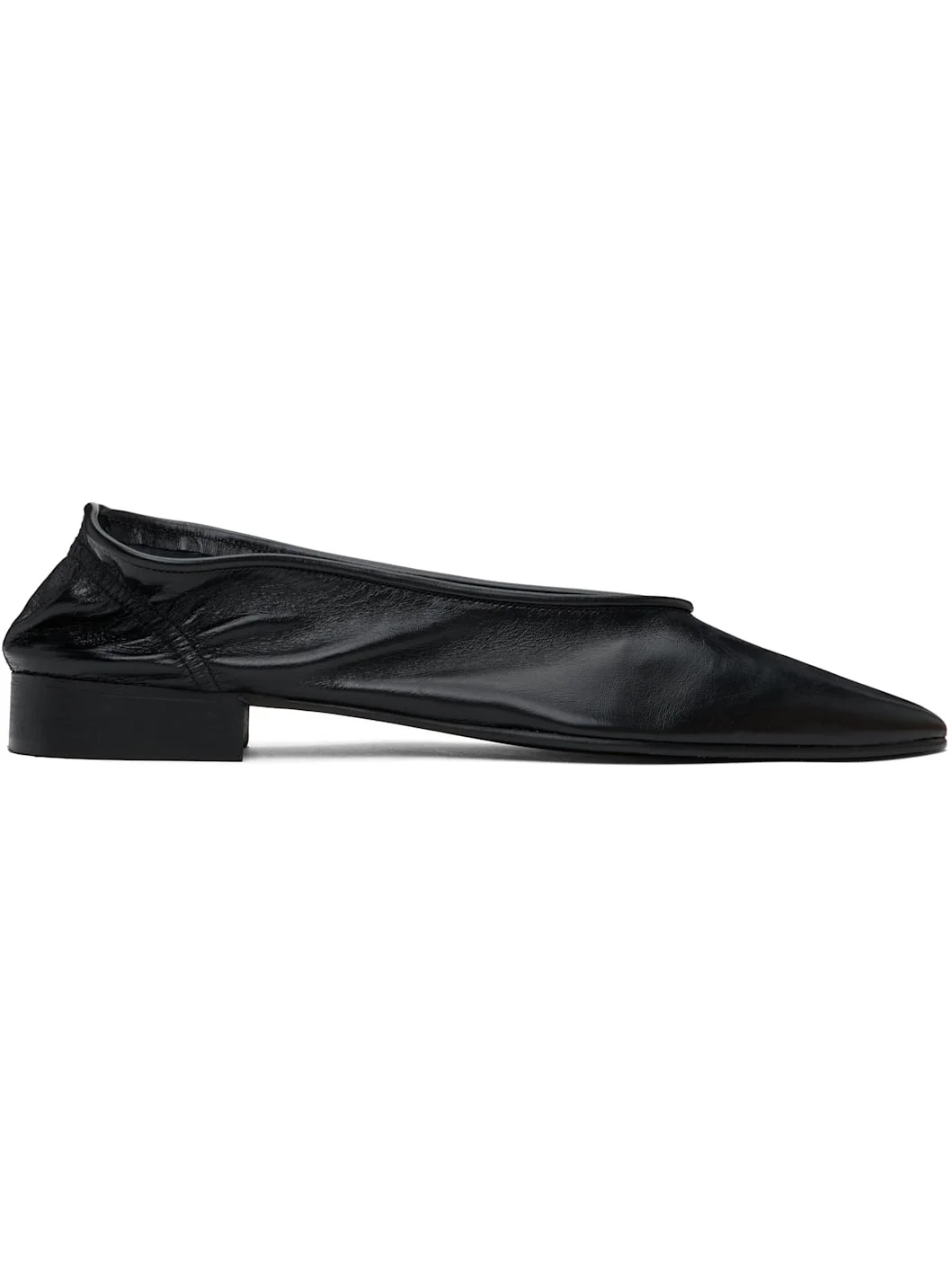 Crinkled lambskin ballerina flats in black. · Pointed toe · Piping at collar · Grained leather padded footbed · Elasticized heel counter · Stacked leather heel · Leather sole with rubber injection · Heel: H1" Supplier color: Black Upper: lambskin. Sole: leather, rubber. Made in Bulgaria 251289F118002